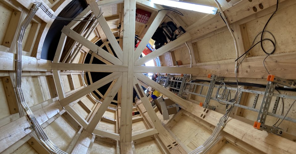 Dabei wurde bei den eingebrachten Elektroinstallationen verschärft darauf geachtet, dass kein Elektrorohr beim Überstülpen des Holzkörpers über den stählernen Aufzugsschacht im Weg war.