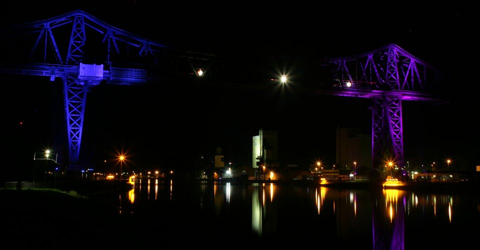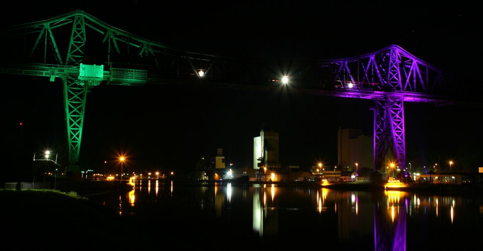 BILD 1 Die Farbe blau wurde auf der Südseite eingestellt und wird von der Schwebefähre vom Südufer zum Nordufer transportiert. Während des Farbtransports sind die Pylone weiß beleuchtet.